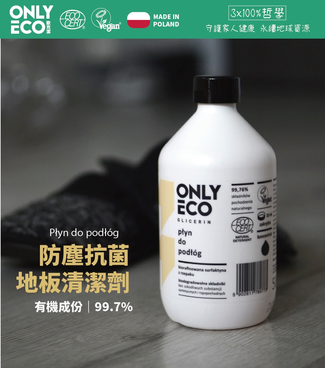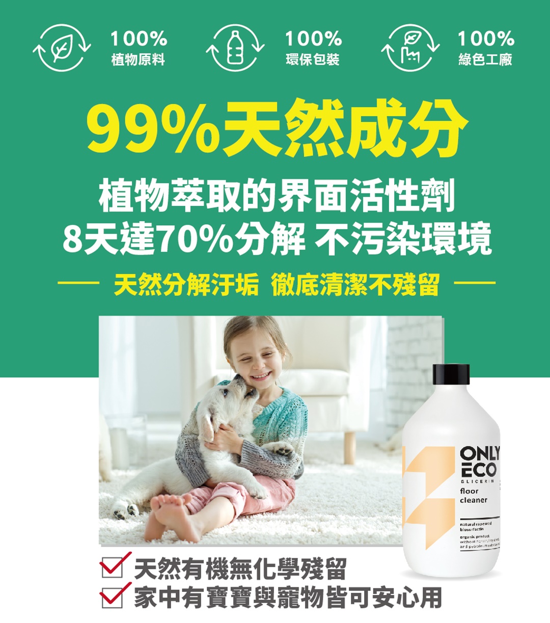 99.70%有機成分;專利油菜籽介面活性劑搭配檸檬酸,有效去除污垢、灰塵,適用木質、磁磚、大理石、陶瓷、塑膠等各式密封型地板,且清理完後附著保護膜,使表面具有抗塵效果,100%可生物分解,榮獲歐盟ECPCERT環保和Vegan素食認證,絕不使用:SLS、NTA、EDTA、對羥基苯甲酸酯、PEG、甲醛、氯、硼酸鹽、化學漂白劑等石化產品