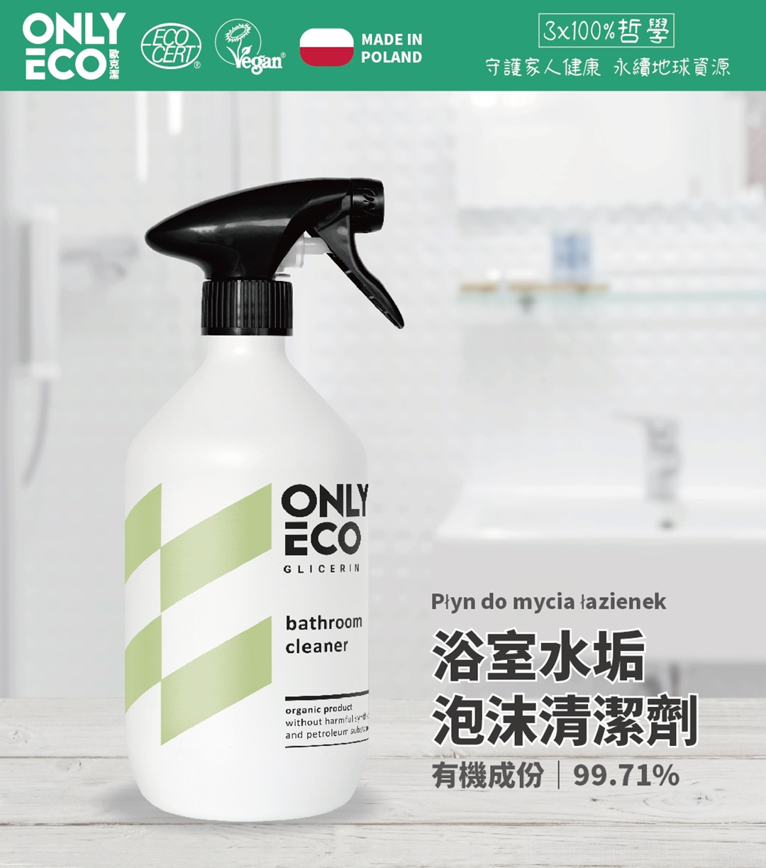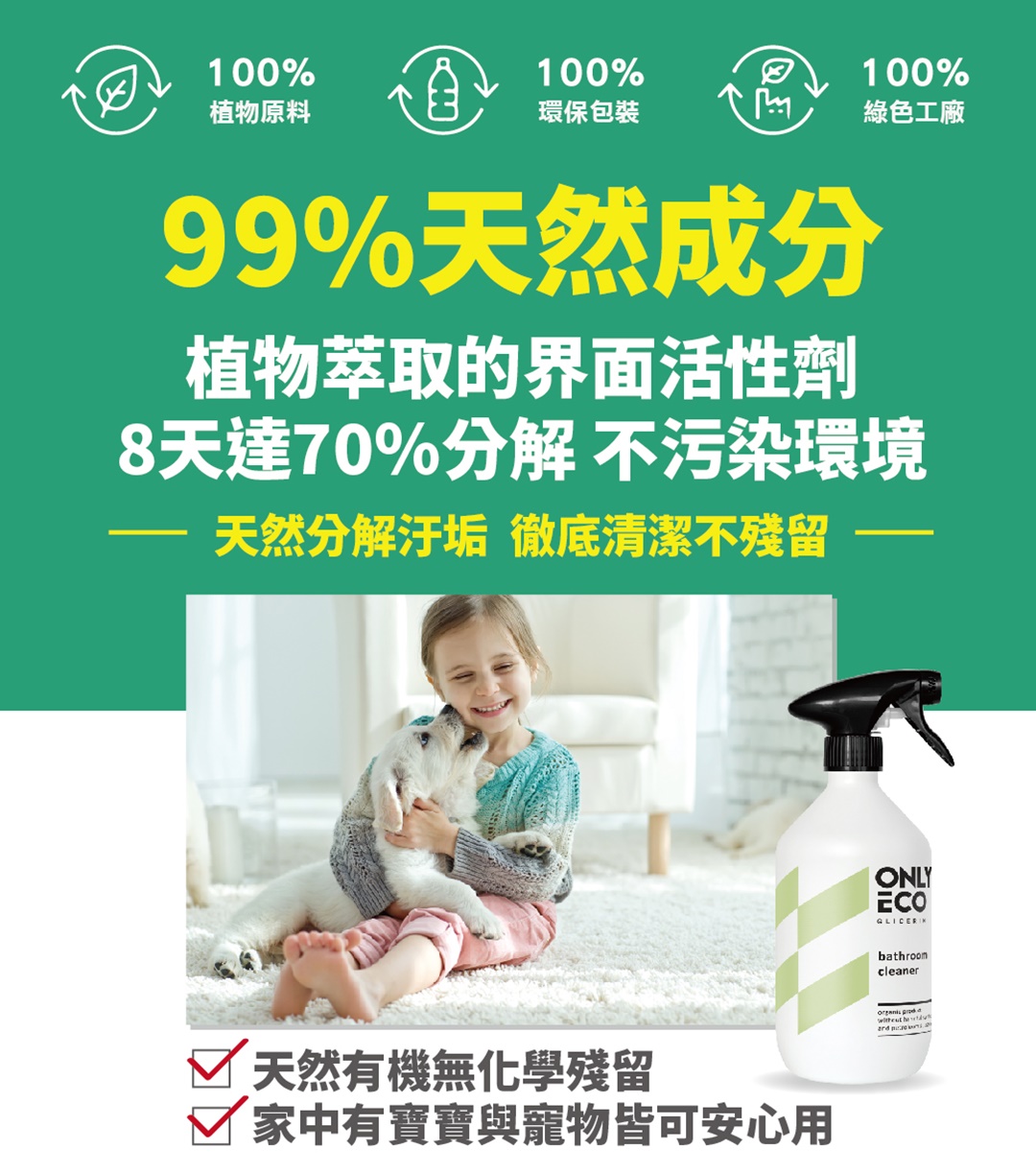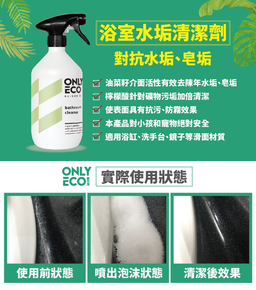 99.71%有機成分;專利油菜籽介面活性劑搭配檸檬酸,有效去除頑固水垢、皂垢、礦物污垢,適用清潔浴缸、洗手台、鏡子、分離式玻璃等滑面材質,且清理完後附著保護膜,使表面具有抗污、防霧效果。100%可生物分解,榮獲歐盟ECPCERT環保和Vegan素食認證,絕不使用:SLS、NTA、EDTA、對羥基苯甲酸酯、PEG、甲醛、氯、硼酸鹽、化學漂白劑等石化產品。